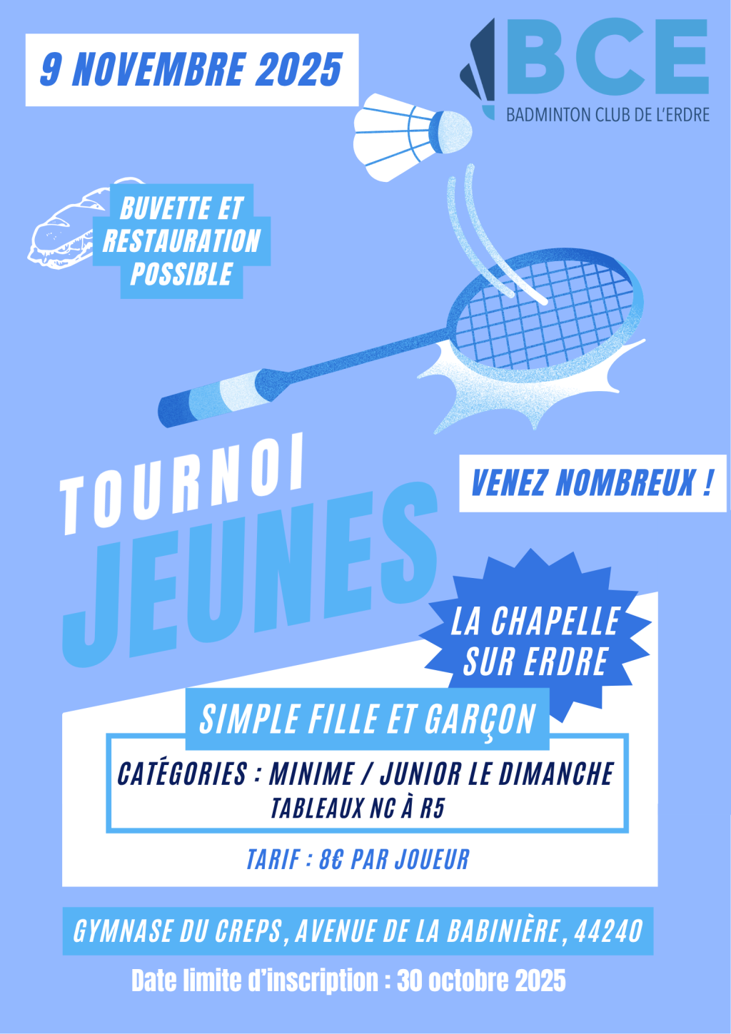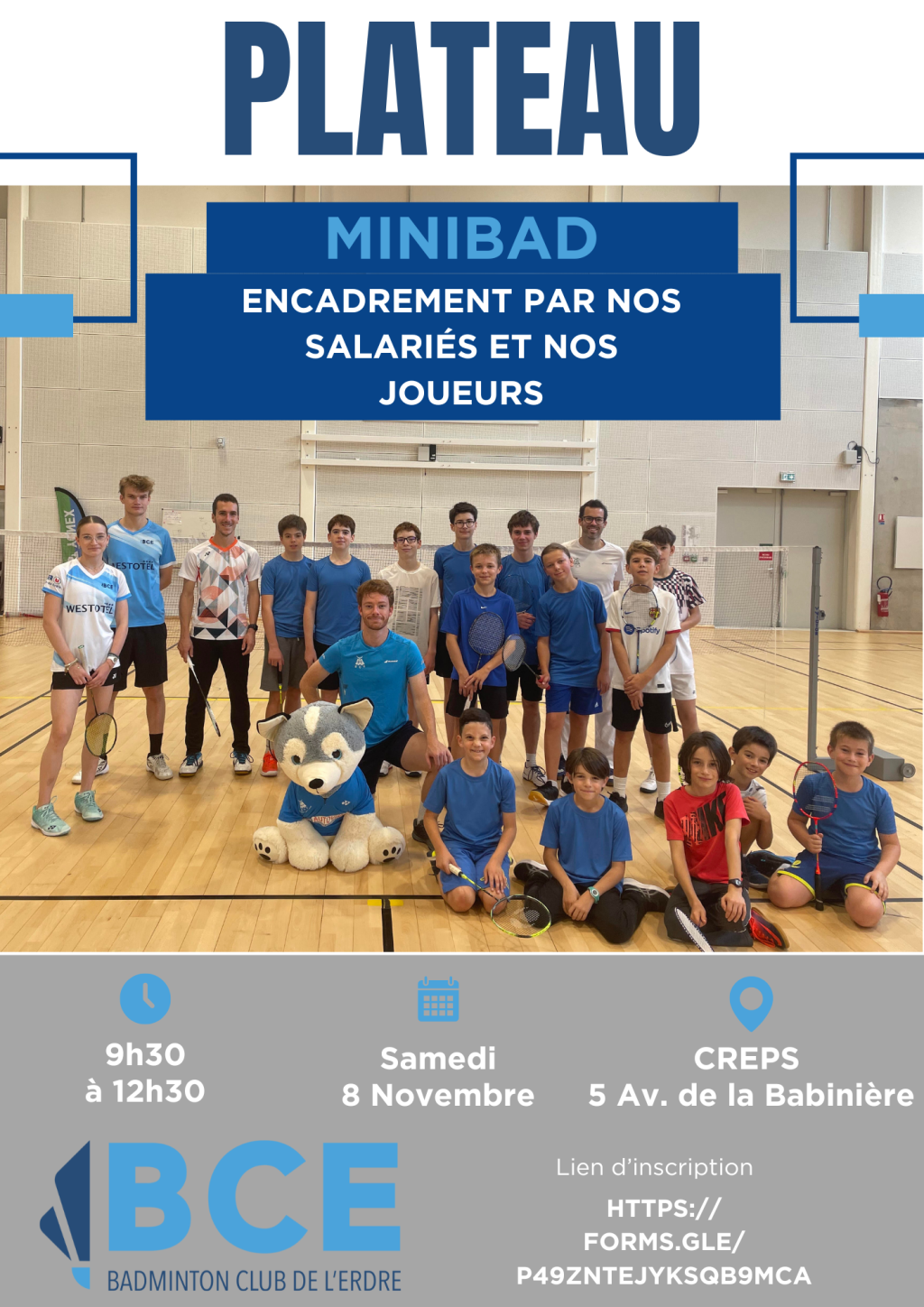 Bonjour à tous, Le BCE vous invite à son plateau Minibad/Poussin qui aura lieu le Samedi 8 Novembre au CREPS des Pays de la Loire. L’objectif de cet événement est de[…]